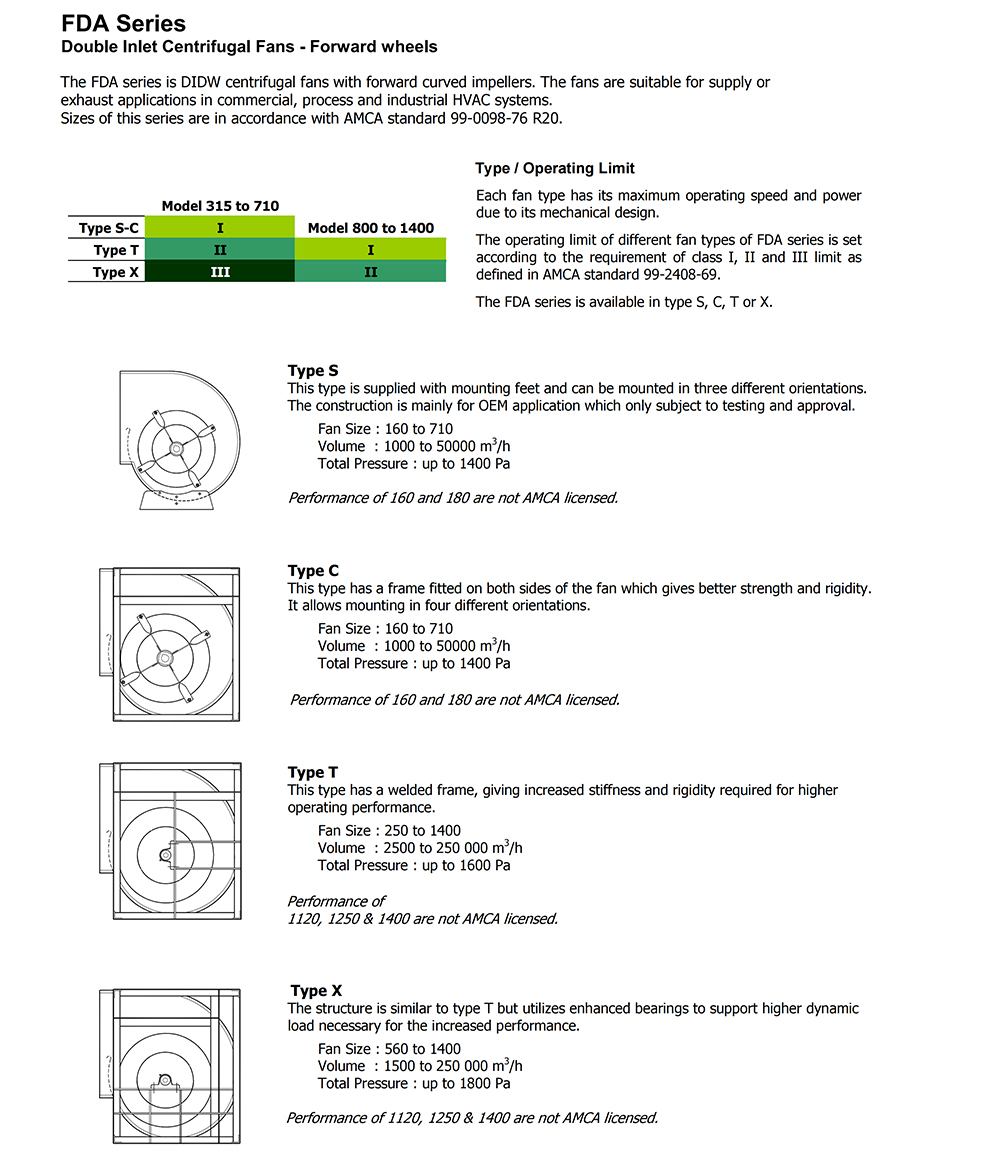 The FDA series is DIDW centrifugal fan with forward curved (FC) impellers. The fans are suitable for supply and exhaust applications in commercial, process and industrial HVAC systems.