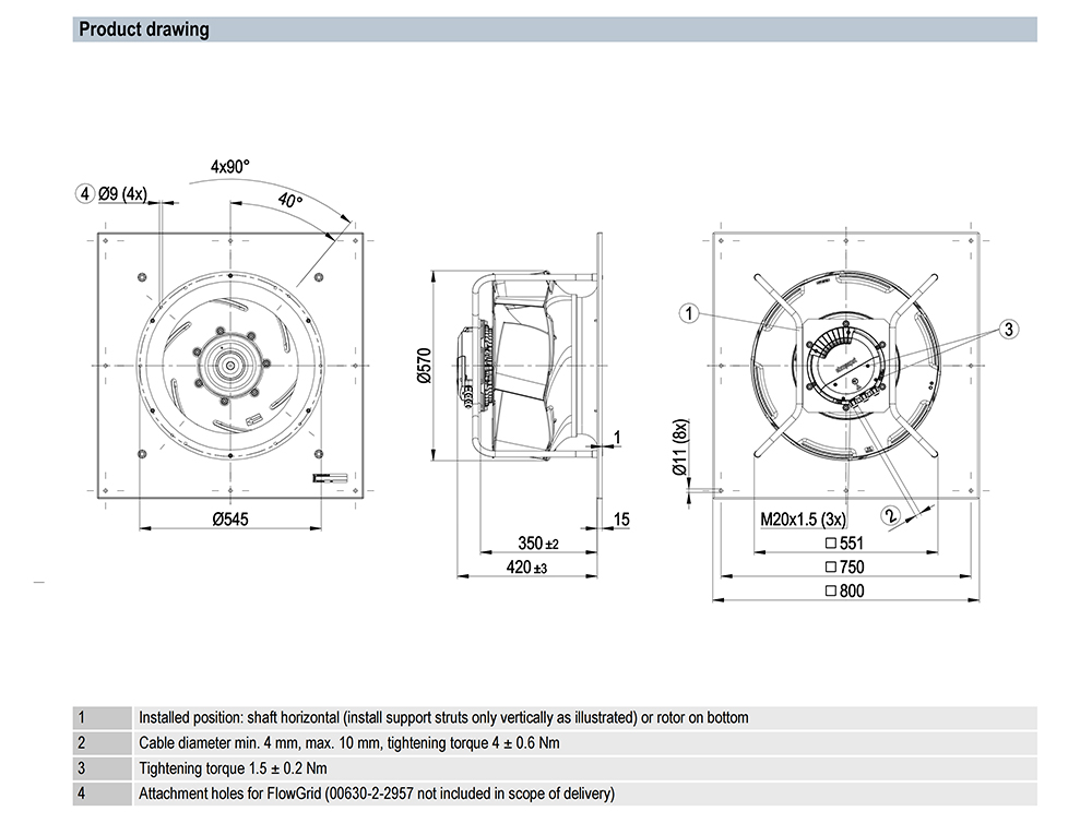 560mm EC drive optimized for high static pressure. Anti-vibration bracket for industrial exhaust and ventilation units under continuous heavy load.