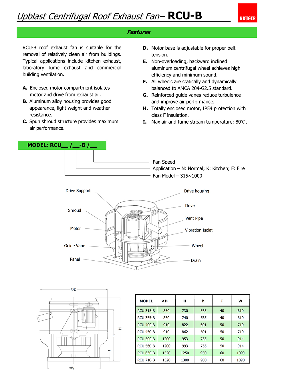 RCU roof exhaust fan is suitable for the removal of dirty, contaminated and/or high temperature air from processes and buildings. Typical applications include restaurant hoods and similar kitchen exhaust ventilation, fume and smoke removal, laboratory fume hood exhaust and chemical process exhaust.