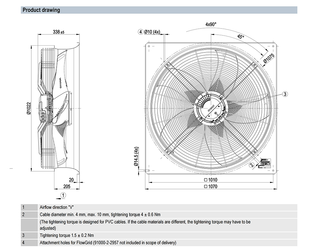 910mm massive EC axial fan. F05/F06 variants offer specific wiring/control options. Features HyBlade® technology for low noise, ideal for cooling towers and transformers.