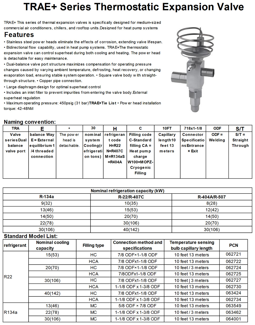 Genuine EMENSON TRAE+20HC thermostatic expansion valve for air conditioning and cold storage (20 refrigeration tons).