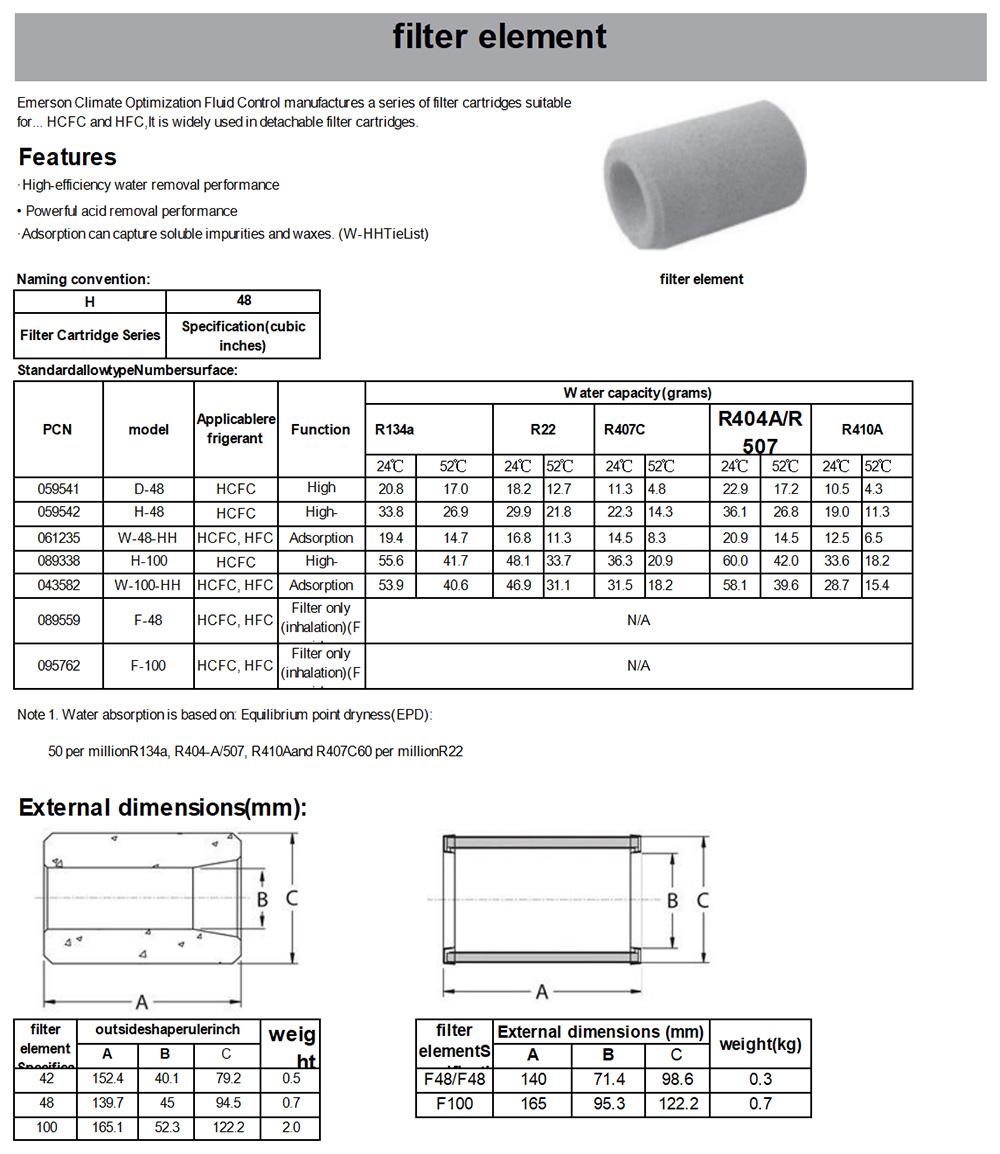 Genuine Emerson H100 drying filter cartridge, high acid and water removal, water absorption filter cartridge